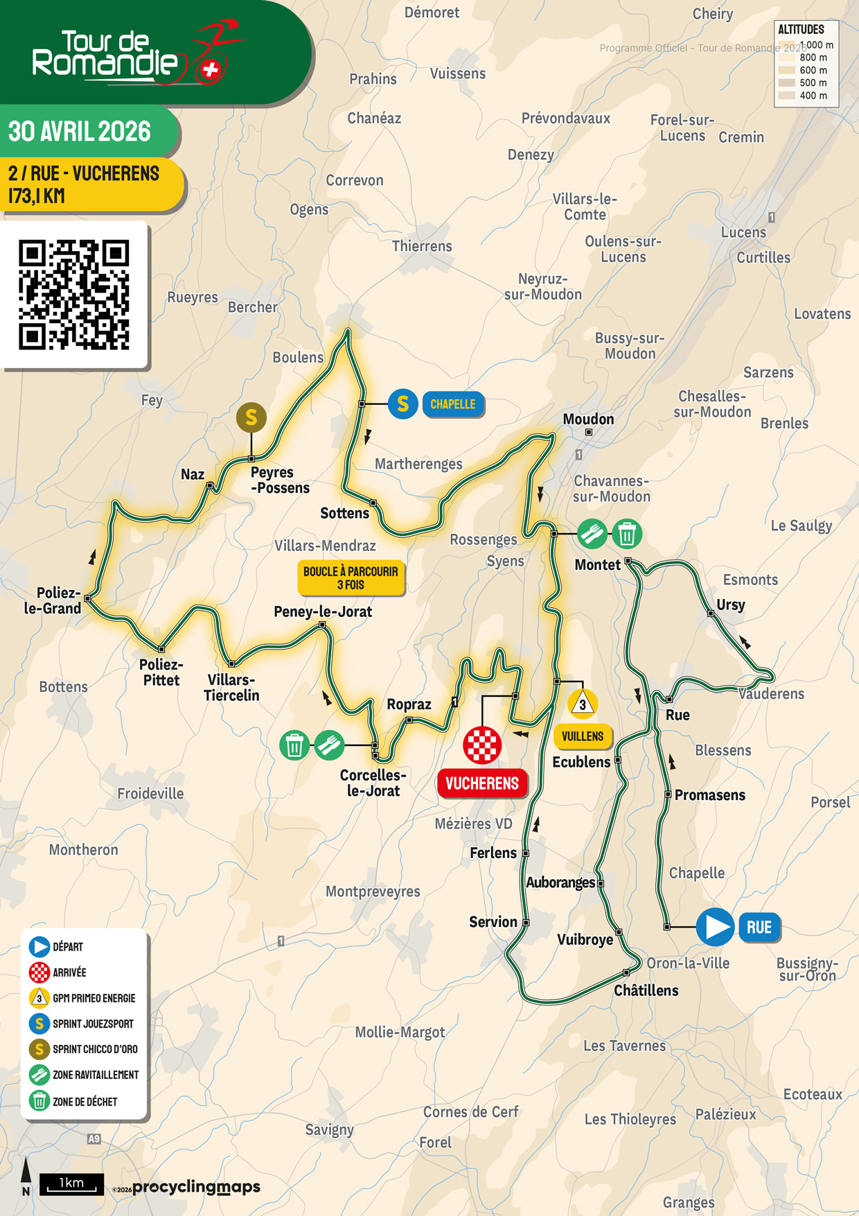 It takes place on 30-04-2026, between Rue (SUI) and Vucherens (SUI), its length is 173.1 km, and the scheduled start and end times are from 13:00:00 to 17:16:00.